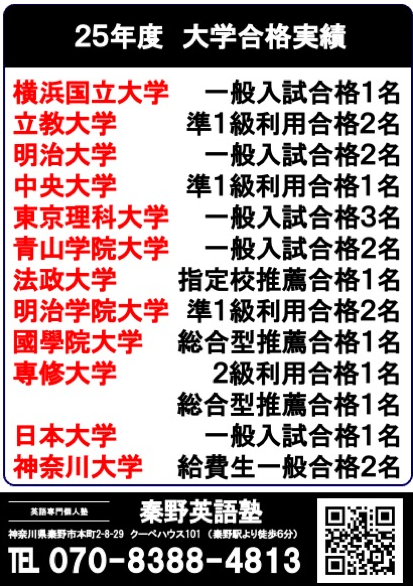 秦野英語塾 2025年度合格速報ポスター