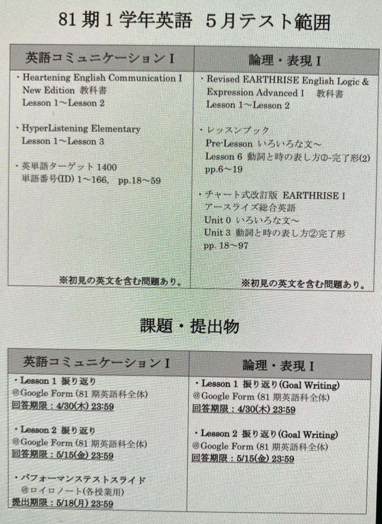 英語のテスト範囲が発表されました。